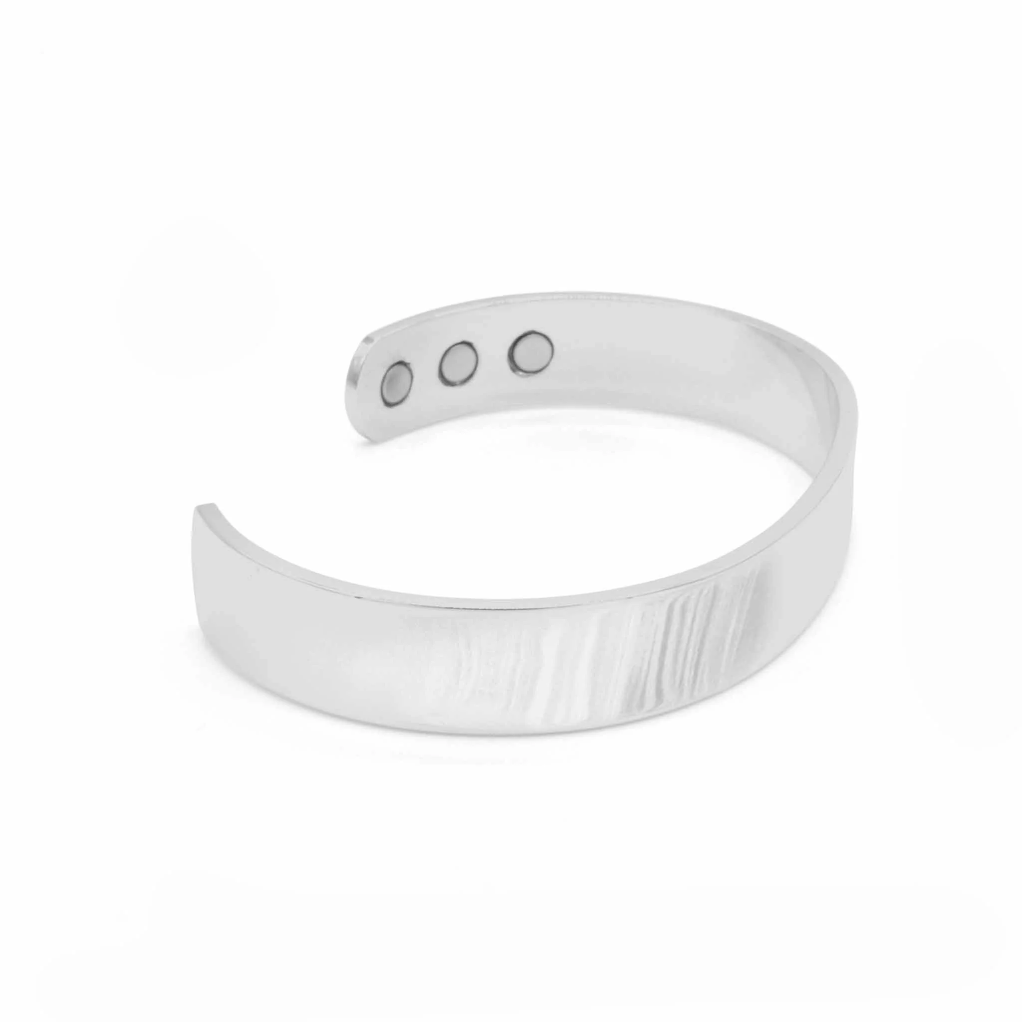Modern, contemporary and cool this wide silver cuff bracelet combines style and function. The minimalist finish ensures that it is versatile enough to wear with any outfit, day or night and also whilst playing sports. The silver therapeutic magnetic bracelets are a natural pain relief, they help improve blood circulation and general well-being, they can also help with arthritic joints, RSI and sport injury’s. This sleek men’s silver magnetic bangle would make a lovely gift for Christmas, birthdays or any special occasion.