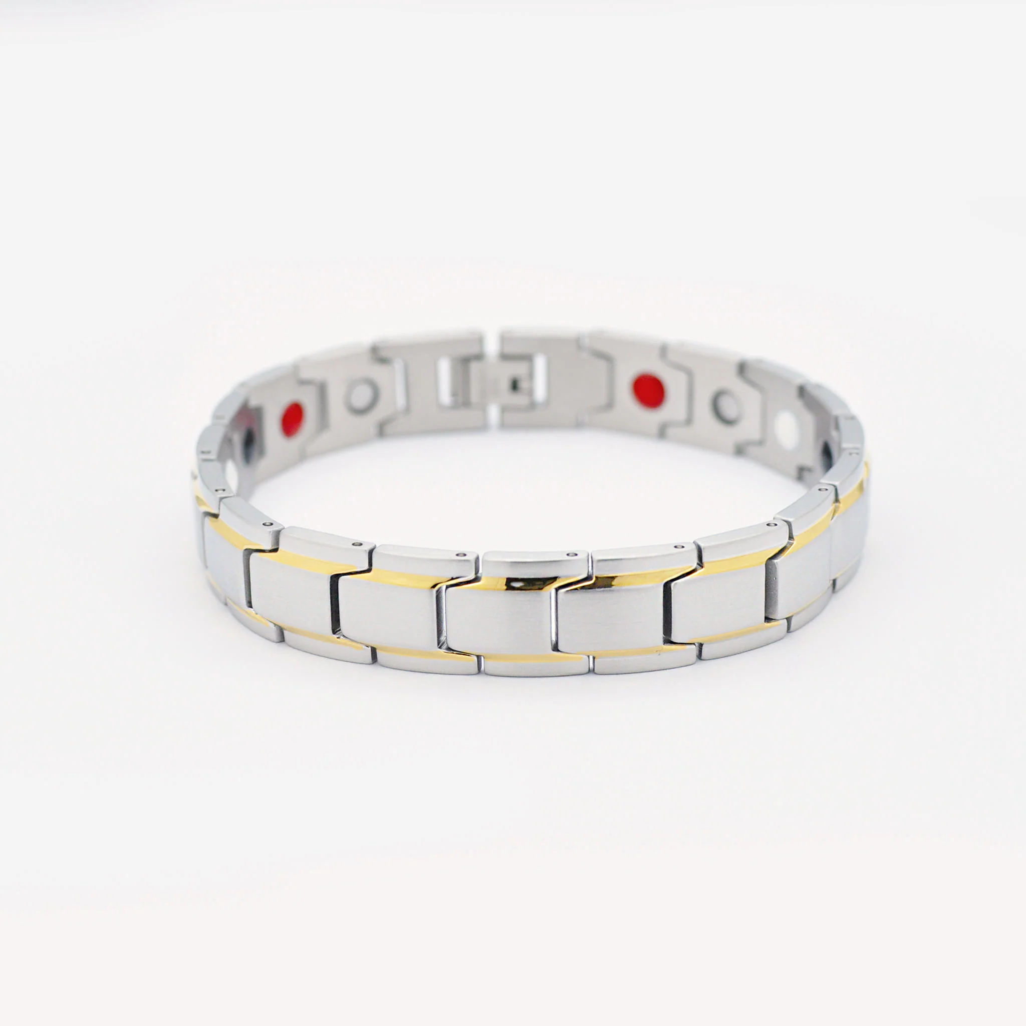 An extremely easy to wear and very contemporary take on magnetic bracelet for men, this subtle and elegant magnetic bracelet is made of robust stainless steel and has narrow rectangular links with a very thin band of gold detailing on the top and the bottom of the bracelet. This slight attention to detail makes this arthritis bracelet look luxe and original, a great gift or just treat yourself! This stainless steel magnetic bracelet is easily shortened to fit any size or wrist comfortably. Sports a strong fold over clasp to keep it secure.